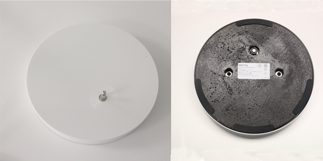 WiT的身材雖然十分"苗條",但是體重可不輕,足足4.7Kg。WiT的"底盤很穩(wěn)",筆者估計(jì)底座有3Kg左右,這樣的設(shè)計(jì)也是為了支撐超長(zhǎng)的燈桿。底座表面為乳白色,底部為黑色,有四塊弧形膠質(zhì)貼片分散在底部,增加底座摩擦力。