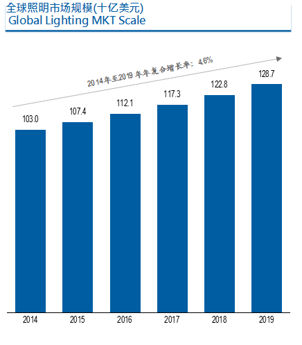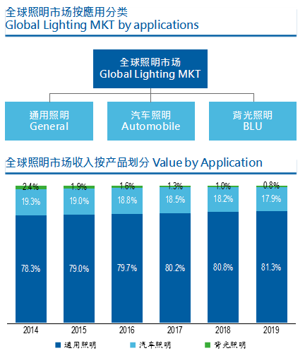 林紀(jì)良先生援引資料表示,全球照明市場整體規(guī)模到2019年預(yù)計將達(dá)到1287億美元,2014年至2019年年復(fù)合增長率預(yù)計達(dá)到4.6%。按產(chǎn)品劃分,全球照明市場可分為通用照明、汽車照明和背光照明。其中,通用照明為主要產(chǎn)品,占整體全球照明市場總額的80%左右。