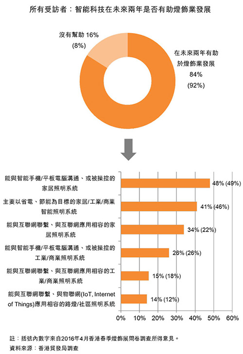 此外,分別有15%及14%受訪者認(rèn)為,商業(yè)照明及家居照明是2017年增長潛力最大的產(chǎn)品類別。與此同時(shí),有10%認(rèn)為智能燈飾及照明方案在明年的增長潛力最大,這比率與今年4月的調(diào)查結(jié)果相若。另外亦有10%受訪者認(rèn)為戶外照明在2017年的增長潛力最大,較4月調(diào)查所得的6%比率為高。