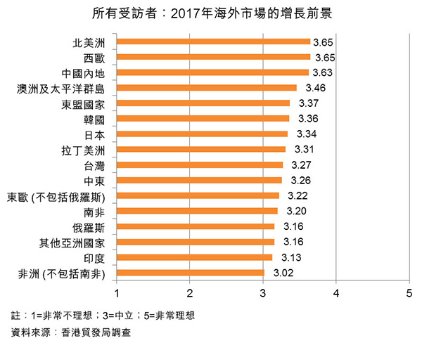 至于個(gè)別市場的增長前景,北美洲及西歐兩大傳統(tǒng)市場被視為2017年最具增長潛力的市場,兩者均獲得3.65分,亦較中國內(nèi)地的3.63分為高。緊隨其后的是澳洲及太平洋群島、東盟國家、韓國、日本和拉丁美洲。事實(shí)上,所有市場的得分都在中立水平的3分以上(評(píng)分由1至5),反映業(yè)界普遍對(duì)全球市場感到樂觀。