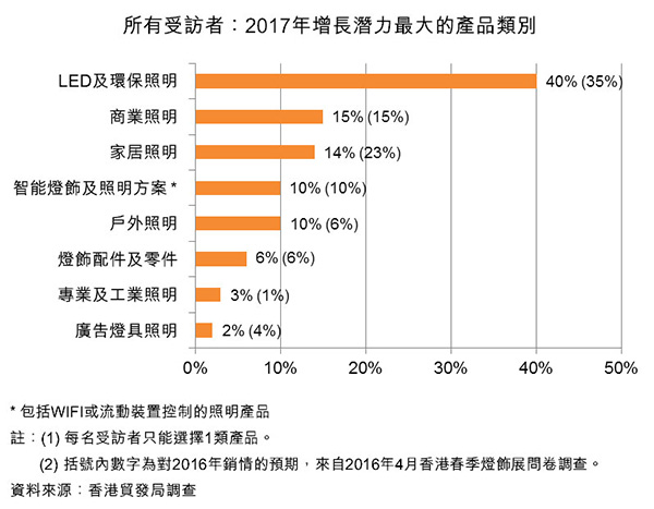 在10月進(jìn)行的調(diào)查中,最多業(yè)者認(rèn)為LED及環(huán)保照明是2017年增長潛力最大的產(chǎn)品類別,獲40%受訪者選擇。LED照明中,被視為增長潛力最大的主要應(yīng)用領(lǐng)域?yàn)槭覂?nèi)家居照明、智能照明系統(tǒng)以及室內(nèi)辦公室及商業(yè)照明,分別獲32%、21%及14%受訪者認(rèn)同。