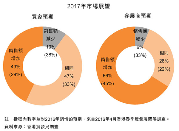 在秋季燈飾展上,43%受訪買家及66%受訪參展商預(yù)期2017年的銷售額較2016年有所增加。值得注意的是,這個(gè)比率較今年4月同一展覽的調(diào)查結(jié)果顯著上升。至于預(yù)期明年銷售額減少的受訪者比率則有所下降,分別僅占受訪買家的10%和參展商的6%。整體來說,縱然今年燈飾業(yè)銷售表現(xiàn)平平,但業(yè)界對2017年市場前景頗感樂觀。